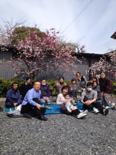工場の駐車場で満開に咲いた花桃の木の前で皆でお弁当を食べてみた。